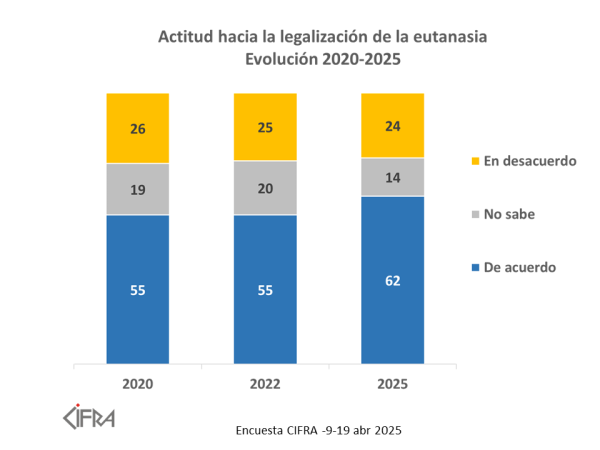 No es una opinión “del momento”. Desde 2020 CIFRA registra una cómoda mayoría a favor de la legalización y sólo una minoría en contra. Los juicios se mantuvieron estables hasta 2022, y en esta medición se registra un crecimiento de 7 puntos (de 55 a 62%) de los juicios favorables, y una caída de 1 punto (de 25 a 24%) de los juicios en contra.