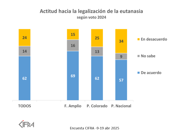 En los debates sobre el proyecto para legalizar la eutanasia se observan distintas posiciones partidarias: la mayoría de los legisladores del Frente Amplio estaría a favor y parte de la oposición estaría en contra. A nivel del electorado, la mayoría absoluta de los votantes de los tres partidos están a favor, aunque la mayoría es aún más grande entre los frenteamplistas.