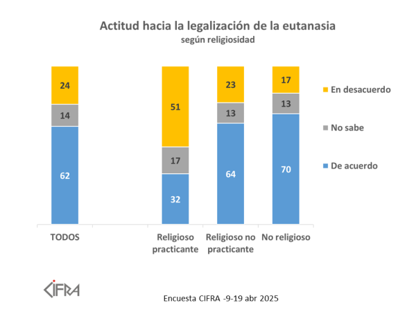 De todos los grupos analizados, en el único grupo donde la mayoría absoluta (51%) está en contra de legalizar es en el de las personas que se consideran religiosas practicantes, que son el 16% del total de adultos. En este grupo minoritario sólo un tercio está a favor. Entre el grupo más numeroso de religiosos no practicantes, que representan otro 30% de la población, casi dos tercios está a favor de la eutanasia y sólo el 23% en contra, y son aún más favorables quienes no se consideran religiosos.