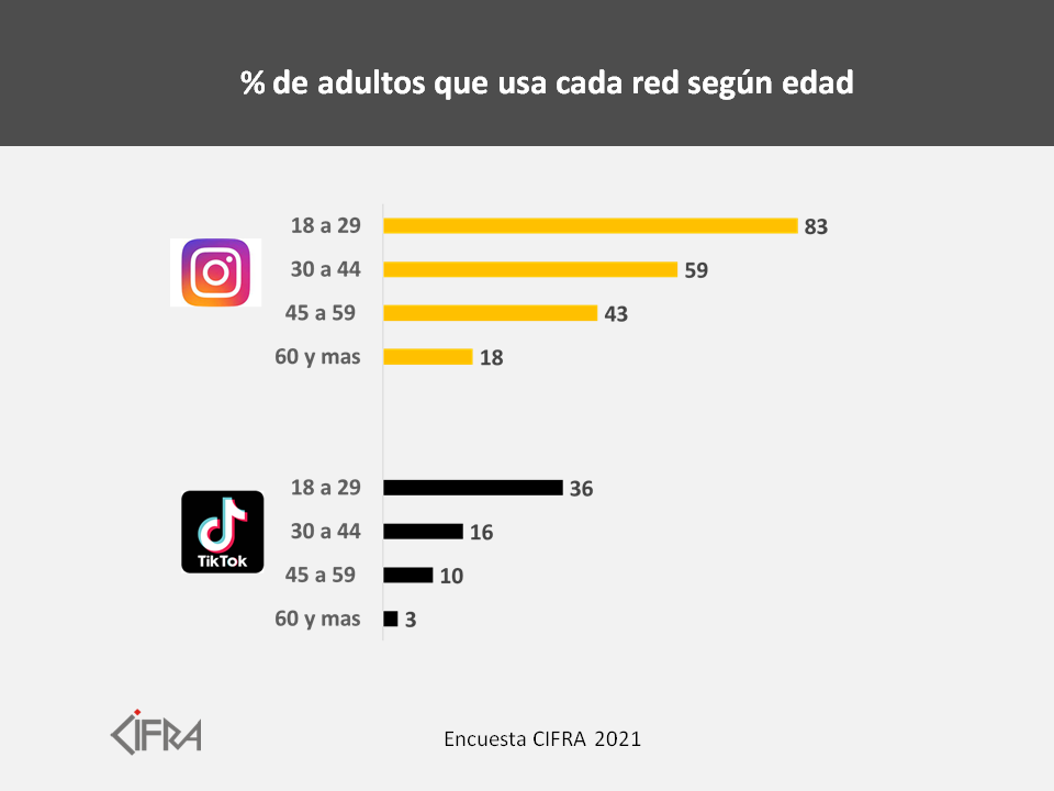 ¿Cuál es la red más usada? En Uruguay, Whatsapp, por amplio margen: de cada 10 adultos, 9 usan Whatsapp. La sigue en popularidad Facebook, usada por 7, e Instagram, por 5. Twitter, tan popular entre los políticos, es mucho menos usada por el conjunto de la población, y aún más de nicho es TikTok.