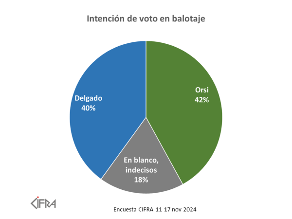 Falta menos de una semana para el balotaje, y en estos días los dos candidatos realizarán el cierre de sus campañas. En la encuesta terminada ayer, justo una semana antes del 24, el 42% dice que votará a Orsi y el 40% a Delgado. Sin embargo, hay casi un quinto que aún no sabe a quién votará.