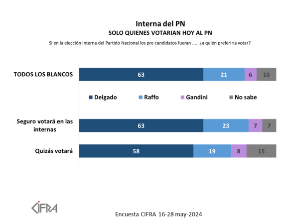 En la interna del Partido Nacional hay 5 precandidatos. Alvaro Delgado es el preferido por el 63% de quienes piensan votar al partido, Laura Raffo por el 21% y Jorge Gandini por el 6%. El líder, Delgado, supera a la segunda por 42 puntos. La diferencia apenas se achica cuando se analizan las preferencias de quienes seguramente votarán: entre los más entusiastas Delgado cuenta con el apoyo del 63% y Raffo con el del 23%, mientras que Gandini sube un punto, a 7%.