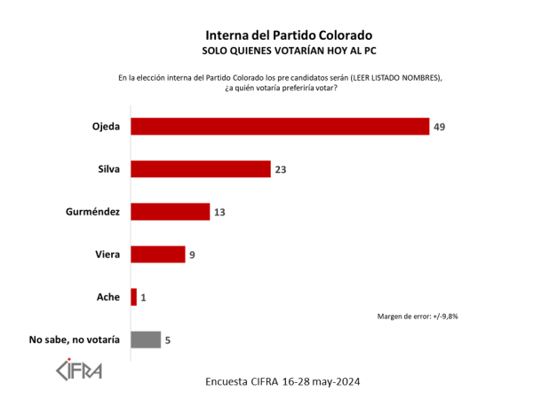 Respecto a la interna del Partido Colorado, los datos de la encuesta son solamente indicativos del posicionamiento de los candidatos entre el conjunto de votantes que hoy podría votar al partido en octubre. Como son pocos, el margen de error de los datos es mayor, pero el problema más grande es que sólo parte de ellos efectivamente concurrirá a votar en la interna. En una interna donde participarán pocos electores, el resultado dependerá muy fuertemente del poder de convocatoria de cada precandidato, mucho más que de las preferencias del conjunto de los colorados. Con esta salvedad, el líder que hoy resulta más atractivo para casi la mitad de los colorados es Ojeda, Silva aparece en segundo lugar, con el 23%, seguido de Gurméndez con el 13%, Viera con el 9% y Ache con el 1%.