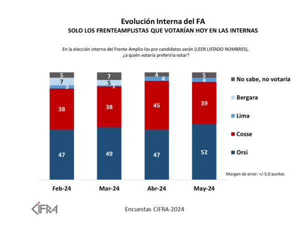 En la interna del Frente Amplio quedan tres candidatos en competencia. Entre quienes hoy votarían al Frente Amplio, 58% prefiere a Yamandú Orsi, 32% a Carolina Cosse y 5% a Andrés Lima. La diferencia entre Orsi y Cosse es hoy de 26 puntos. Si se miran las preferencias del 55% de los frenteamplistas que dicen que seguramente concurrirán a votar el domingo 30 de junio, Orsi capta al 52% y Cosse al 39%. La diferencia entre Orsi y Cosse se achica, y es de 13 puntos. El margen de error de estos datos, de los frenteamplistas que hoy dicen que seguramente participarán en la elección, es de 5 puntos en más o en menos, con lo cual Orsi y Cosse podrían estar más cerca de lo que muestra esta encuesta.