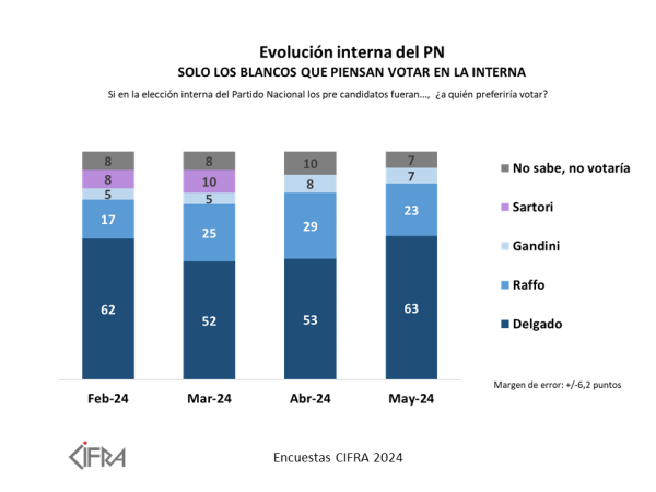Cuando se analiza la evolución de los apoyos entre quienes piensan votar en las internas, se observa que Delgado empezó su campaña en febrero generando mucho entusiasmo entre los blancos militantes, entusiasmo que decayó en marzo y abril, cuando bajó 10 puntos, pero ahora vuelve a conquistar los mismos 10 puntos que había perdido. En cambio, Raffo, siempre desde una posición minoritaria, había logrado crecer entre febrero y abril, pero ahora tiene una caída de 6 puntos.