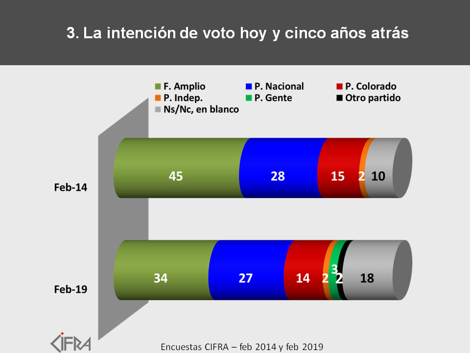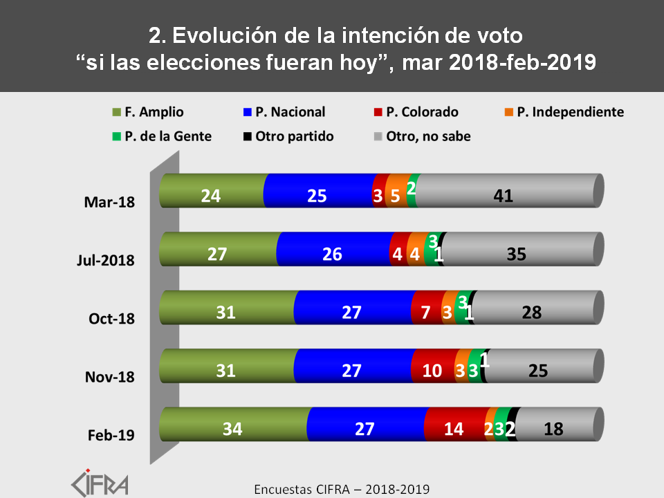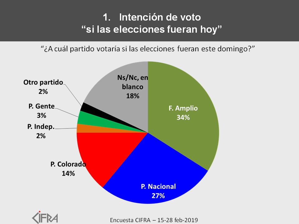 Hoy el 34% votaría al Frente Amplio, el 27% al Partido Nacional, el 14% al Partido Colorado, el 3% al Partido de la Gente y el 2% al Partido Independiente. El 2% menciona otros partidos. El resto, 18% de los votantes, votaría en blanco, anularía su voto, no sabe o no dice qué votaría.