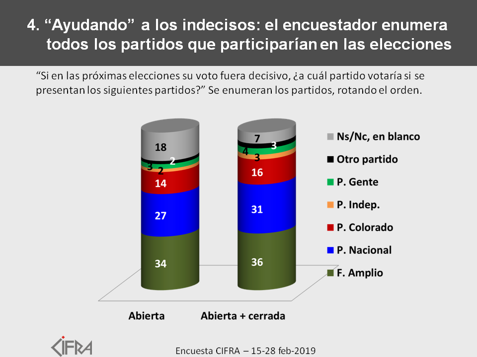 - Si en las próximas elecciones su voto fuera decisivo, ¿a cuál partido votaría si se presentan los siguientes partidos? (Se mencionan, rotando, los 7 partidos que tienen menciones espontáneas en la pregunta anterior: Frente Amplio, Partido Nacional, Partido Colorado, Partido Independiente, Partido de la Gente, Unidad Popular y PERI)