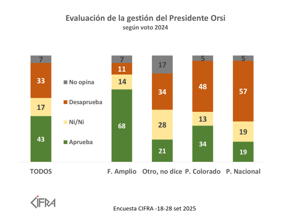 La camiseta política pesa en las opiniones: de cada 10 frenteamplistas, 7 aprueban el desempeño de Orsi y solo 1 desaprueba. En el otro extremo del espectro se ubican los blancos: de cada 10 blancos, casi 6 desaprueban y solo 2 aprueban la gestión del presidente.