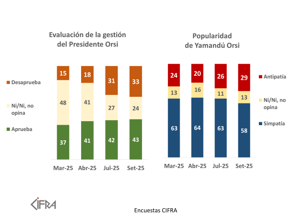 ¿Cómo han evolucionado la evaluación de la gestión presidencial y la figura de Orsi como líder desde que asumió en marzo? El porcentaje que aprueba su gestión creció 6 puntos, del 37 a 43%, pero la desaprobación creció más, 18 puntos. La popularidad de Orsi cambió menos: genera un poco menos de simpatía que en la primera mitad del año (era 63%, ahora 58%), y un poco más de antipatía (24% antes, 29% ahora).