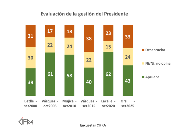 Al comparar los primeros meses de la administración Orsi con las anteriores, se observa que hubo tres gestiones que a esta altura recibían una evaluación más positiva: la mejor evaluada fue la de Vázquez en su primer gobierno, seguido de cerca por Lacalle Pou y Mujica. Orsi se ubica cuarto, con una evaluación bastante menos positiva que la de Mujica, pero mejor que la de Vázquez en su segundo gobierno y Batlle en el año 2000.