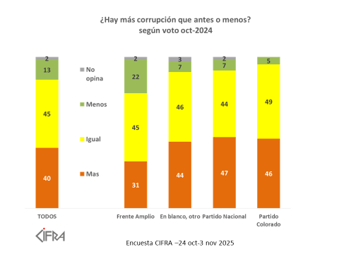 Tal vez por el hecho de que ahora son gobierno, los votantes del FA en octubre de 2024 son los más optimistas, casi un quinto considera que hoy la corrupción es menor que en el pasado. Pero el resto de los votantes casi no aprecian esa mejora. Los más negativos al respecto son los votantes blancos y colorados, un poco menos de la mitad considera que la corrupción ha aumentado respecto al pasado. Es posible que los votantes suelan ser benévolos con los gobiernos que votan y miren con recelo respecto a este tema a los gobiernos de otras camisetas.