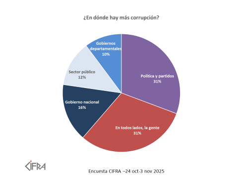 Y la clave está en los lugares en los que se percibe esta corrupción hoy, allí las opiniones se dividen casi en tercios. Uno considera que hoy hay más corrupción en todos lados, otro tercio cree que hay más en la política en general y en los partidos y el tercio más grande la ubica en algún lugar del Estado: en el gobierno nacional, en el sector público en general o en los gobiernos departamentales.