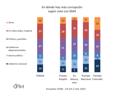 Los colorados son los más divididos al respecto, un cuarto menciona a la política en general como lugar de más corrupción y otro al gobierno nacional, pero estos votantes son los que más señalan la presencia de corrupción en otros ámbitos por fuera de lo público y la política.