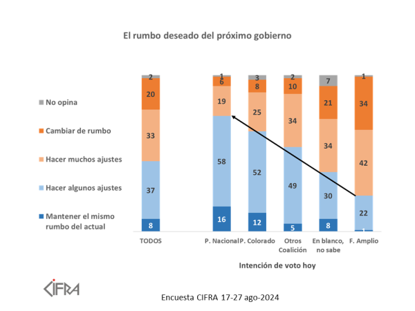 Los matices importan: la gran mayoría de quienes piensan votar al Partido Nacional o al Partido Colorado quiere a lo sumo algunos ajustes; la gran mayoría de quienes piensan votar al Frente Amplio prefiere muchos ajustes o directamente un cambio de rumbo. Los socios más minoritarios de la Coalición están más divididos, algo más de la mitad prefiriendo pocos cambios y el resto muchos cambios. Entre los indecisos el 55% querría muchos ajustes o un cambio de rumbo y sólo el 38% preferiría pocos cambios.