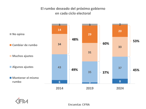 ¿Cómo está el clima hoy en comparación con los ciclos electorales anteriores? En 2014 casi la mitad quería sólo algunos ajustes y otro tanto quería cambios más grandes. Con ese clima de opinión, el Frente Amplio retuvo el gobierno. En 2019 el 60% quería grandes cambios o un cambio de rumbo, y el triunfo fue de la oposición. Hoy el 53% considera que el próximo gobierno tiene que hacer muchos ajustes o directamente cambiar de rumbo.